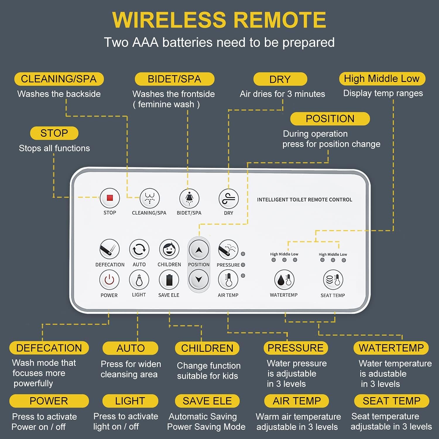 • [Features] This toilet seat has water heater with 3 temperature settings, heated seat with 3 temperature settings, water pressure with 3 temperature settings, warm air dryer with 3 different levels, and save preferred settings.